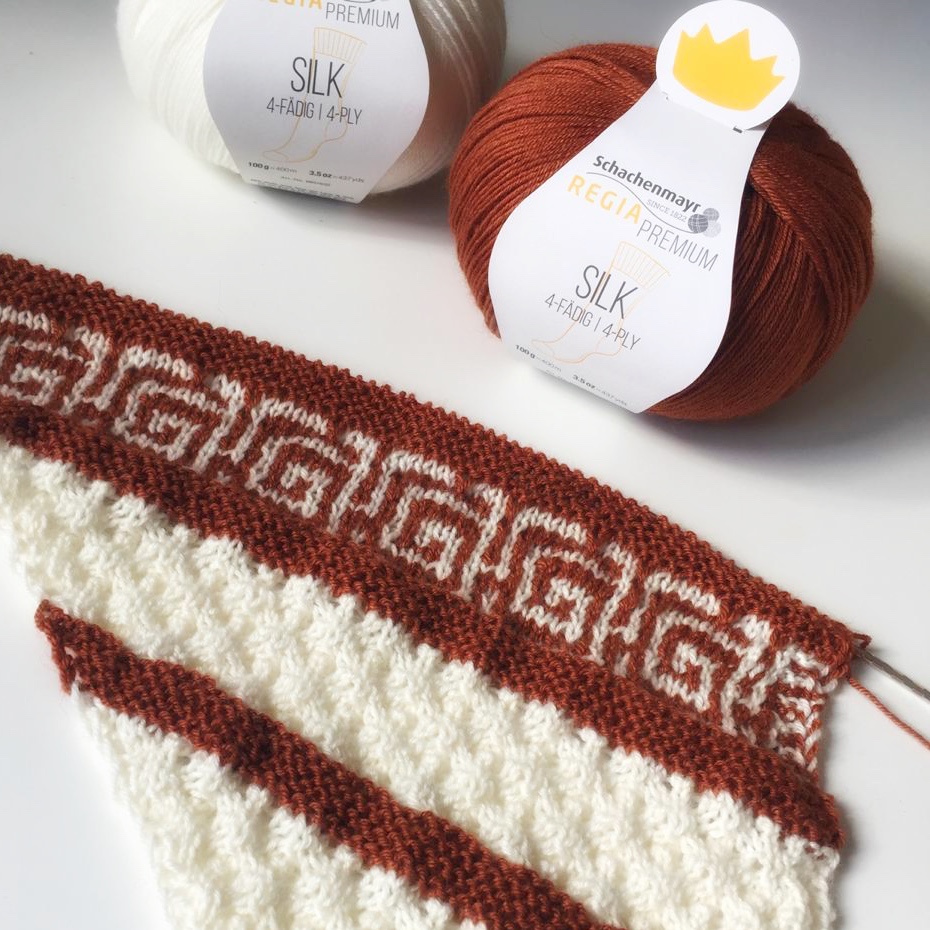 Ein Hingucker beim Slot Egeskov Sjal ist das Mosaikmuster. Damit das Muster wirklich gut zur Geltung kommt, benötigen wir kontrastreiches Garn.